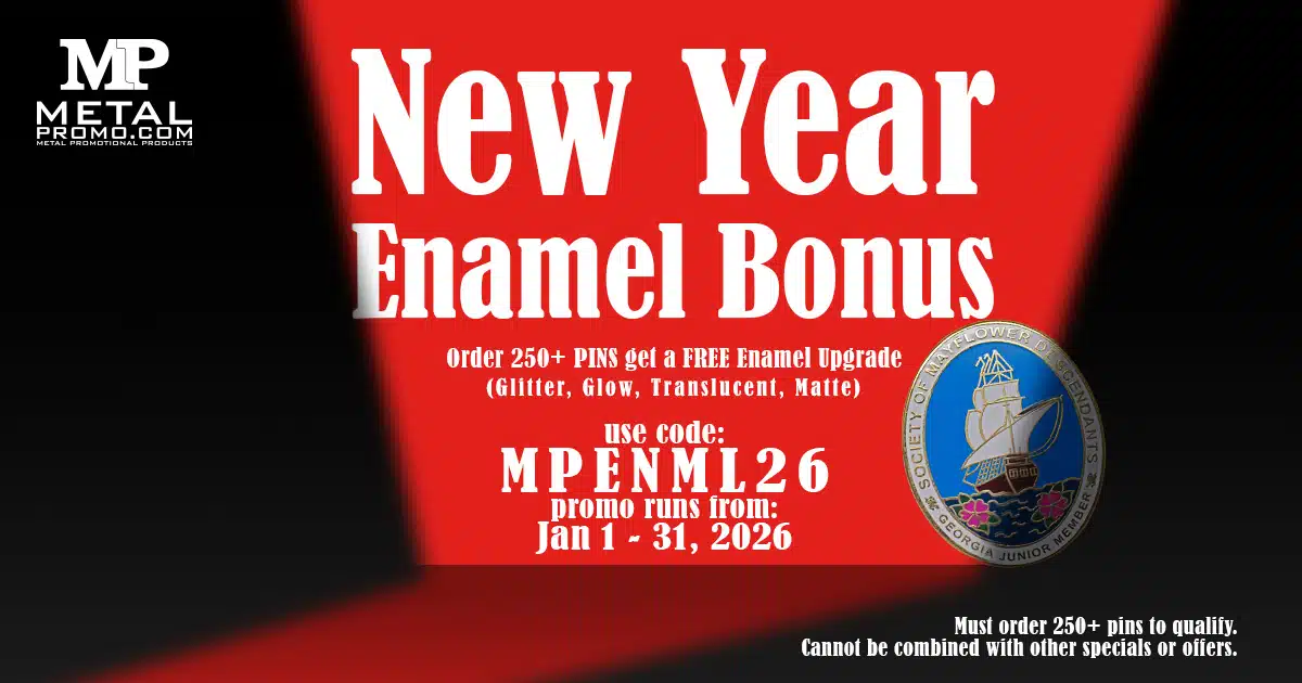 Order 250 pins or more and get a FREE Enamel Upgrade (includes Glitter, Glow, Translucent, or Matte). Offer valid January 1 through January 31, 2026. Use the code below on our quote form to apply.