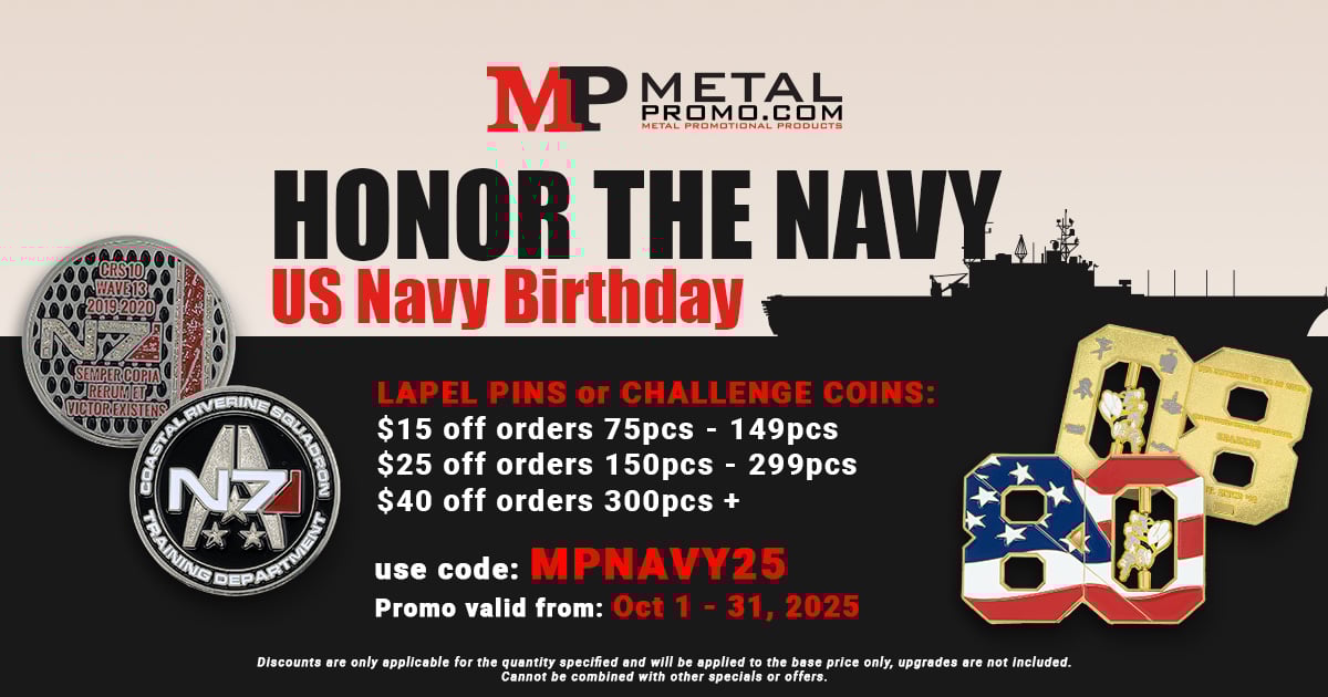 Get a QuoteThis October, we honor the US Navy Birthday with special savings on Lapel Pins and Challenge Coins: